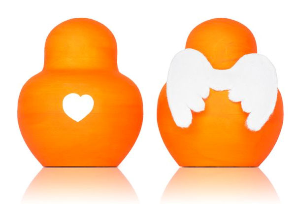 Футляры выглядят как матрешки оранжевого цвета с изображением сердца и белыми крыльями. Марка Masterpeace традиционно для упаковки своих украшений и декоративных элементов вместо обычных коробок использует деревянные матрешки, которые меняют стиль от сезона к сезону. «Мы надеемся, что проект Masterpeace напомнит людям о том, что, созидая, возможно, стоит относиться к жизни чуть проще, легче, позитивнее и стремиться к чему-то новому», – говорит создательница марки Евгения Линович.