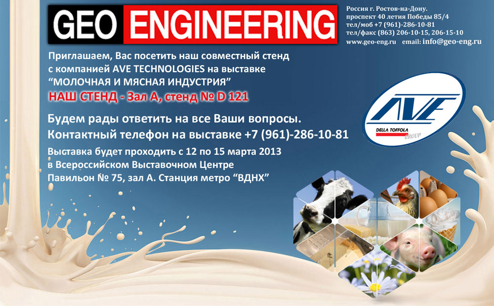 GEO-ENGINEERING и AVE TECHNOLOGIES ежегодно принимающие участие в выставке «Молочная и мясная индустрия», приглашает Вас посетить стенд компании №D121 в пав.75 на ВДНХ.
