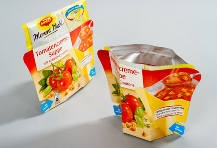 Упаковка Maggi Moment Mahl представляет собой прекрасный пример решения для продуктов быстрого приготовления, которые потребляют на ходу, во время короткого перерыва на работе, или почувствовав легкий голод, когда до обеда или ужина еще далеко. По сравнению с привычными твердыми полипропиленовыми или полиуретановыми емкостями, используемыми обычно для упаковки подобного рода продуктов, рассматриваемая нами упаковка, разворачивающаяся из плоского пакета в суповую чашку, представляется в высшей степени удобной при складировании и транспортировке, поскольку экономит много места.