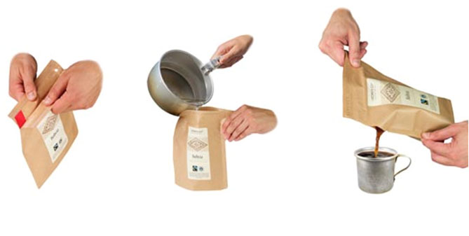 Датский производитель кофе компания Nordic разработала своего рода миниатюрный френч-пресс, названный Coffeebrewer, который размещен прямо в пакете, содержащем порцию кофе.