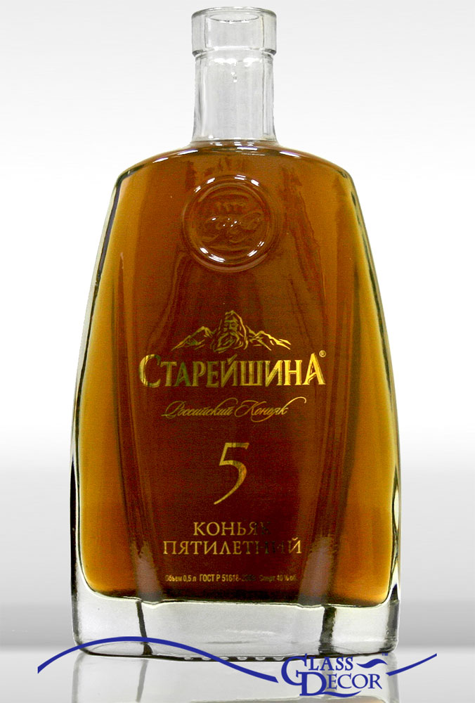 Компания «Гласс Декор» для своего давнего партнера - Группы компаний «АЛВИСА» производит декорирование бутылки под российский коньяк пятилетний «Старейшина».