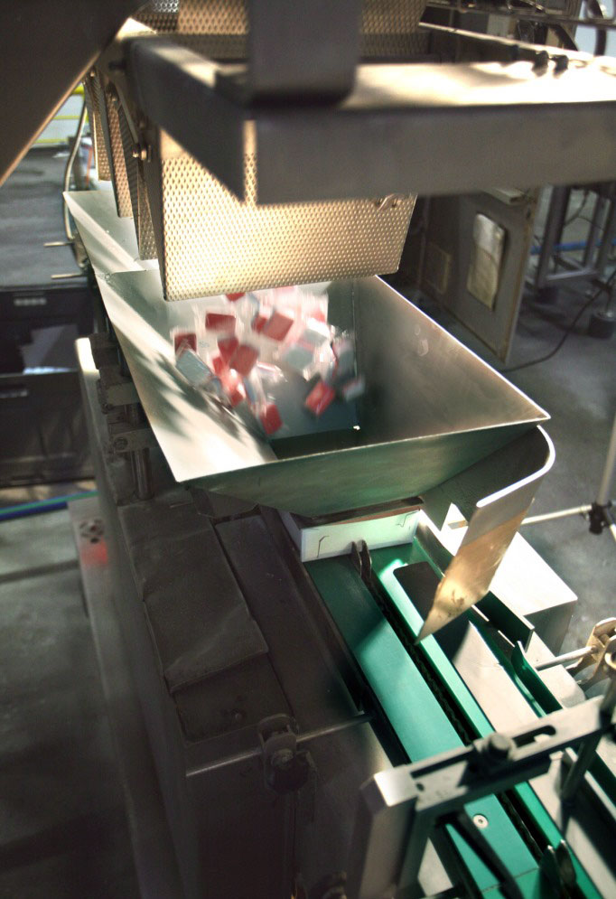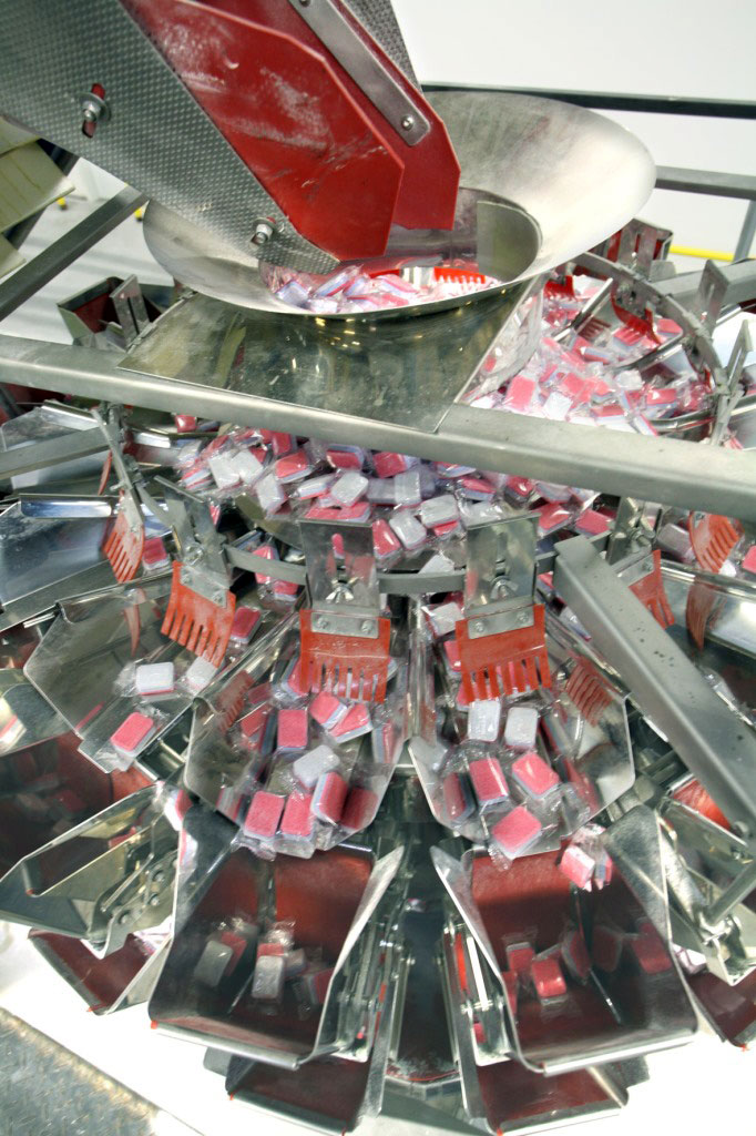 Мультиголовочный весовой дозатор Ishida CCW-R предлагает нескольких весовых комбинаций и возможность надежного и быстрого выбора самой точной комбинации для целевого веса. Модель, установленная на фабрике Thurn, оснащена системой двойной выгрузки, что позволяет направлять продукт по частично наклонному желобу на две упаковочные станции одновременно. Для того, чтобы хрупкие таблетки не повреждались во время быстрого процесса взвешивания, контактные части желоба смягчены резиновыми вставками в наиболее уязвимых местах.