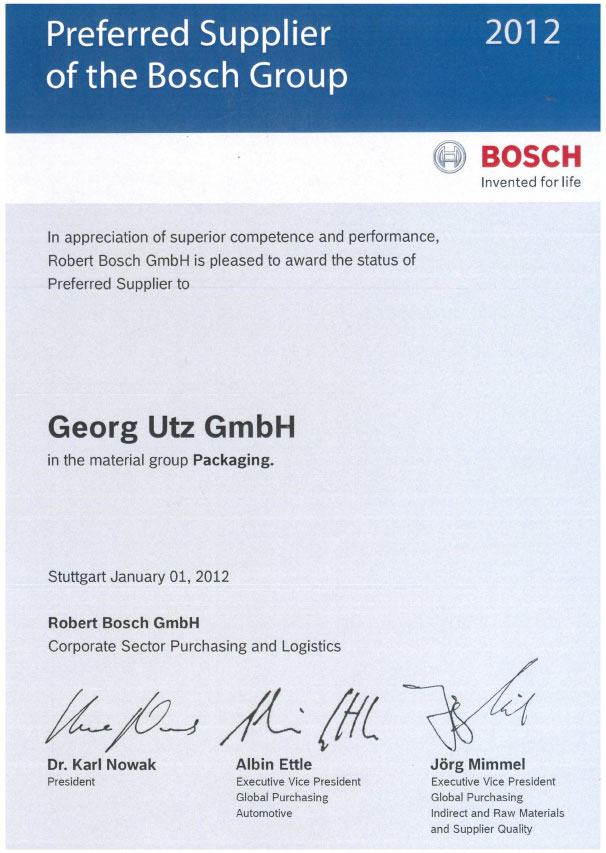 Компания «Георг Утз Гмбх» – немецкое отделение холдинга «Георг Утз» (Georg Utz) - получила официальный титул «Привилегированный Поставщик Группы Бош» («Preferred Supplier of the Bosch Group») в категории упаковка.