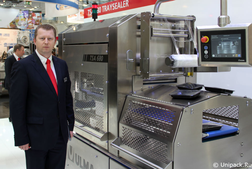 Об экспозиции компании нам рассказал Александр Белай, генеральный директор Ulma Packaging Москва: «Ulma Packaging представляет на выставке все упаковочные системы, как горизонтальные, так и вертикальные, для разных областей применения. В том числе на стенде представлено несколько новинок. Первая новинка – запайщик лотков, разработанный конкретно к выставке Intepack и работающий со скоростью до 20 циклов в минуту и до 15 циклов в минуту при использовании модифицированной газовой среды. Другая новинка – высокоскоростная машина для упаковки кондитерских изделий, работающая со скоростью 80 м в минуту. Производительность составляет примерно 600 упаковок в минуту. Главный момент в том, что машина работает с термосвариваемыми пленками в отличие от техники других производителей, что дает преимущества в работе с пищевыми продуктами. Кроме того, среди новинок – система перезакрывающейся упаковки для нарезанных продуктов. На стенде также представлен робот-загрузчик. В одном корпусе он имеет две руки и позволяет загрузить до 200 продуктов в минуту. Обычно работает одна рука, но если она не справляется, подключается вторая рука. Также посетители могут видеть нашу новую машину под упаковку скин.