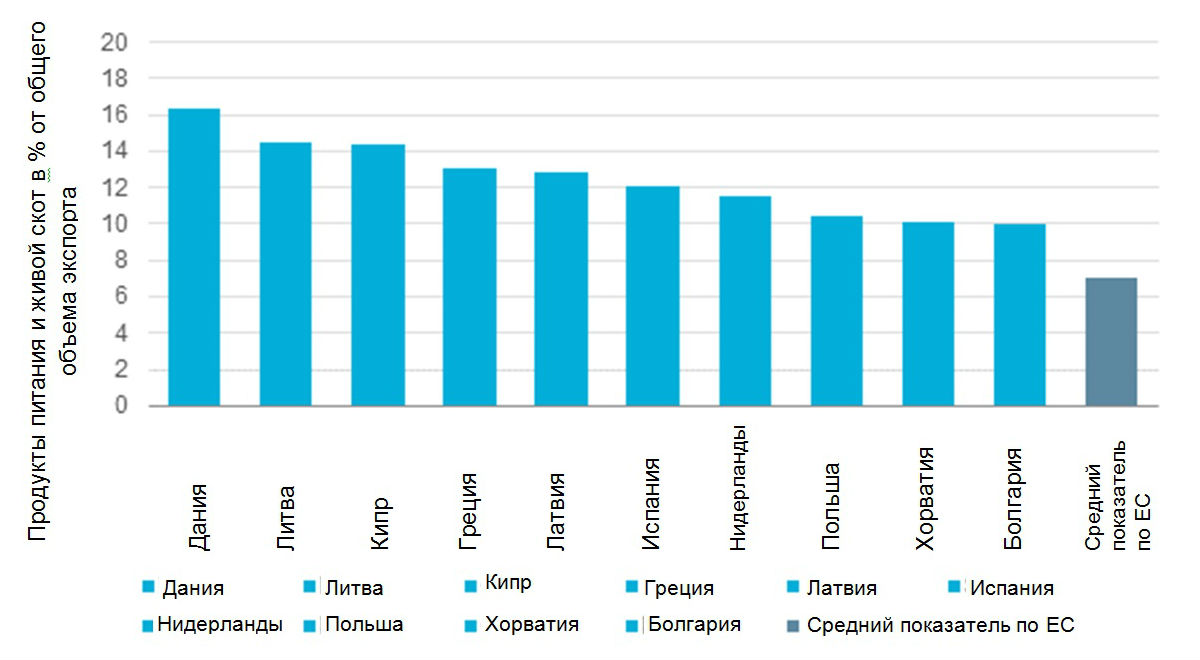 Среди тех, кого коснется этот запрет, наиболее тесные торговые связи с Россией имеет Европейский Союз. В 2013 г. Россия была пунктом доставки для 2,6% от общего экспорта Евросоюза. Объем экспорта в Россию колеблется между 0,4% в Португалии и внушительными 19,1% в Литве. Среди тех, кого затрагивают санкции – страны, которые в наибольшей степени зависят от экспорта сельскохозяйственной продукции (с учетом доли экспорта продукции, представляющей собой продукты питания и живой скот) – это Дания, Литва и Кипр.