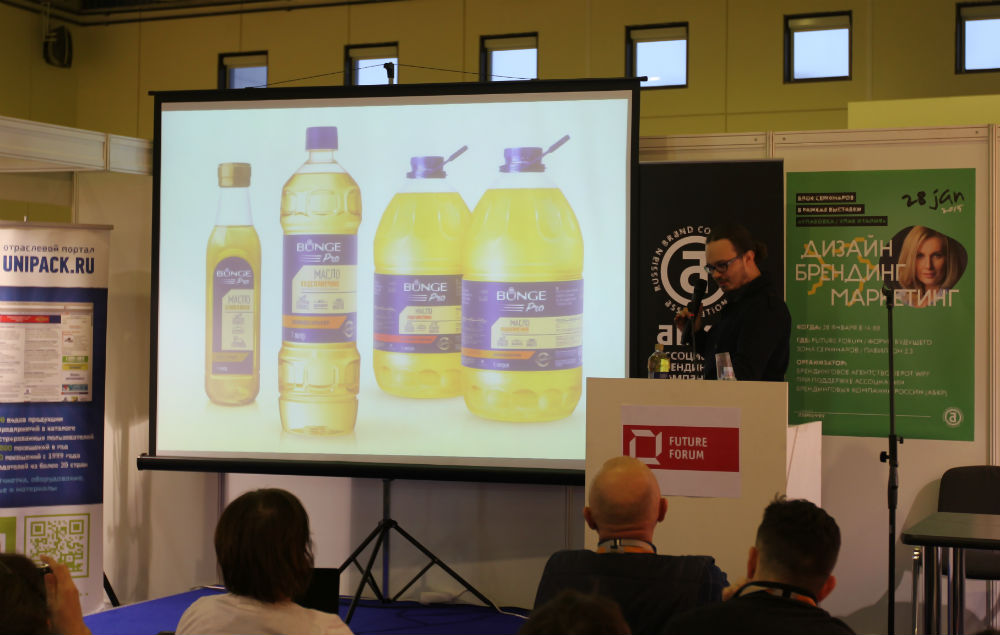Артём Маслов, арт-директор брендингового агентства Clёver, рассказал о необычном бренде для сегмента HoReCa. Речь шла об упаковке растительного масла BungePro. Сложность состояла в том, что в сегменте HoReCa нет торговой полки. Целевая аудитория – профессиональные закупщики и шеф-повара. Дизайнеры решили отталкиваться от нужд шеф-поваров, которые заинтересованы в сокращении времени на поиск нужных продуктов на кухне. На помощь им пришла чёткая цветовая маркировка бренда BungePro.