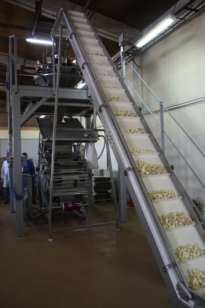 Кольцевой затвор задерживает на несколько секунд продукт перед его сбросом в упаковщик, что снижает скорость падение и как следствие, позволяет значительно сократить количество сколов и разломов продукта. Далее вафли перемещаются в вертикальный упаковщик в пакеты.