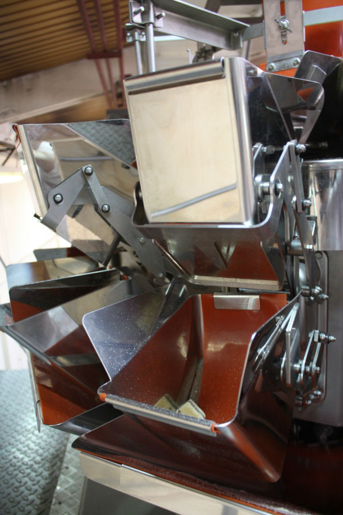 Пологие углы бункеров обеспечивают плавное скольжение, а не падение продукта из весового дозатора в вертикальный упаковщик. Продукт выходит из весовых бункеров и достигает кольцевого затвора, изготовленного из специального ударопоглощающего материала Bancolan.