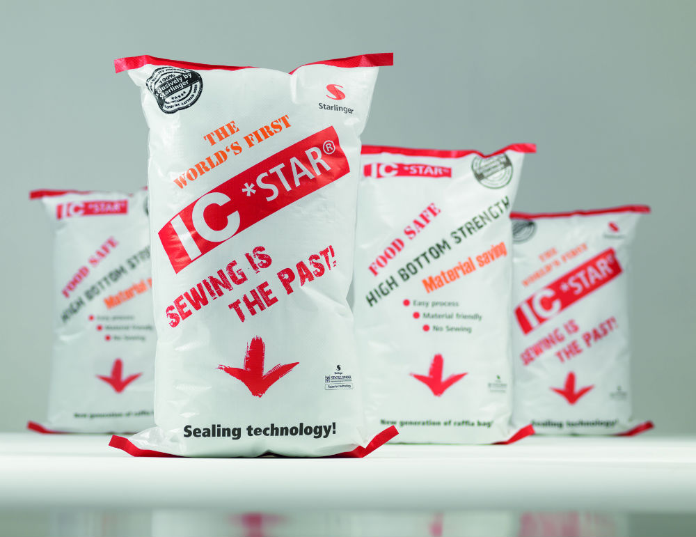 With the IC*STAR sack concept, developed and realised by Starlinger and STATEC BINDER, broken needles, stitch holes and traces of oil on the sack fabric are now destined to become obsolete. ‟Closure of sacks by welding is the solution of the future for standard woven sacks,” Hermann Adrigan, Sales Director of Starlinger & Co. GmbH is convinced. ‟Compared to sewing, the IC*STAR process offers considerable material savings in sack production, consequently requiring less raw material – polypropylene, in this case. Sack producers profit from lower costs, and the reduced carbon footprint is good for the environment.” Material is saved by the elimination of the seam allowance required for a sewn closure, as well as by the use of lighter fabric made possible by the greater sack bottom strength. Moreover, this type of closure makes IC*STAR sacks completely tight – an important advantage especially for packaging fine powdered goods which tend to sift through stitch holes and form dust, presenting a health hazard in some cases. The oil-free production process makes IC*STAR sacks ideal for packaging foodstuffs.