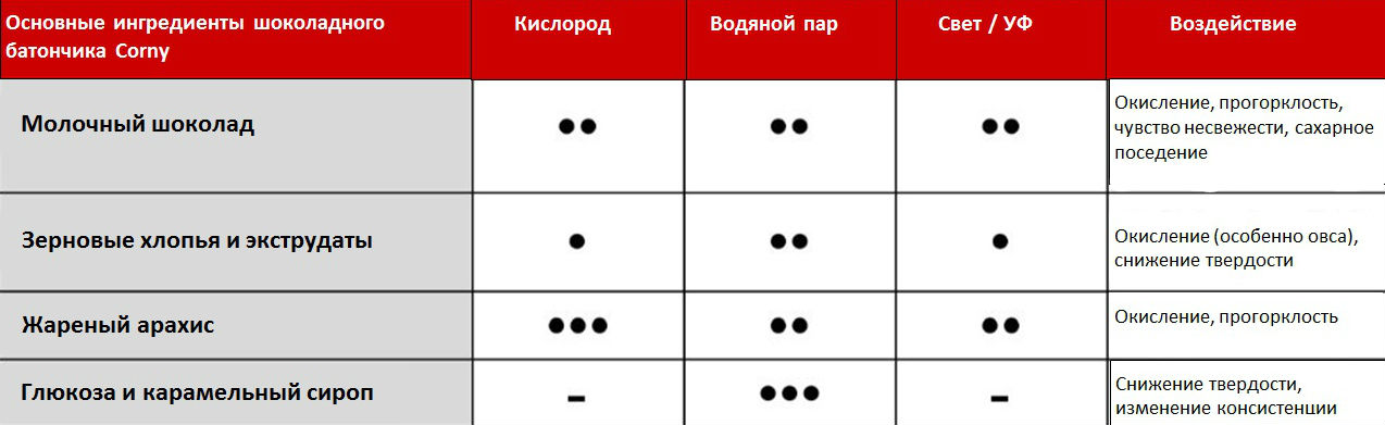 Первичную оценку реагирования продукта я провел, изучая научную литературу и анализируя и оценивая основные ингредиенты батончика. Часто уже заранее известно, как некоторые ингредиенты будут реагировать на внешние воздействия. Например, для арахиса особенно критично воздействие атмосферного кислорода: он окисляется, что может привести к неприятному прогорклому привкусу во рту.