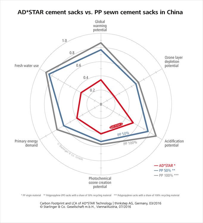 Воздействие на окружающую среду – популярная тема для обсуждения в отношении пластиковых пакетов для повседневного использования – также играет все более важную роль в области промышленной упаковки. Новое исследование, в котором сравниваются различные виды упаковки для цемента, доказывает, что тканая пластиковая тара – самое дружественное решение данной сферы применения по отношению к окружающей среде. Результаты анализа жизненного цикла, выполненного немецкой компанией PE INTERNATIONAL AG (сейчас thinkstep AG) по заказу австрийского поставщика оборудования Starlinger & Co. Ges.m.b.H., ясно показывают, что мешки AD*STAR – сварные клапанные мешки с ромбовидным дном, изготовленные из рукавной полипропиленовой ткани с покрытием – имеют более низкий потенциал глобального потепления (также известный как углеродный след – условный выброс углекислого газа в атмосферу), чем бумажные мешки или сшитые полипропиленовые мешки, которые широко используются, особенно в Азии. Для сравнения был проведен анализ сшитых мешков китайского производства, а также мешков из крафт-бумаги, изготовленных в Саудовской Аравии; все мешки емкостью 50 кг цемента.