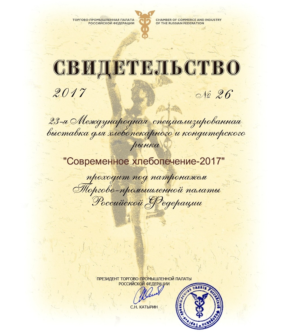 Выставка "Современное Хлебопечение"/ Modern Bakery Moscow 2017 пройдет под патронажем Торгово-промышленной палаты Российской Федерации.