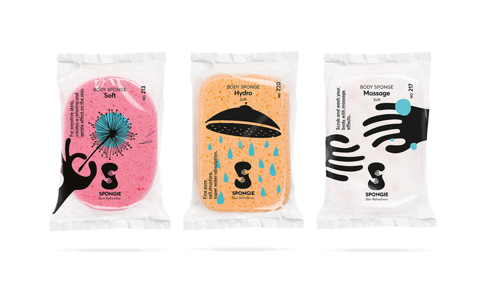 Греческая студия Luminous Design Group разработала дизайн упаковки для серии губок для мытья Spongie. Оказывается, создатели считают эти иллюстрации позитивными. У меня картинка с душем вызывает ассоциацию с информационными значками на картонной таре (не мочить, не кантовать и прочее), а черные руки смутно напоминают образы из социальной рекламы.