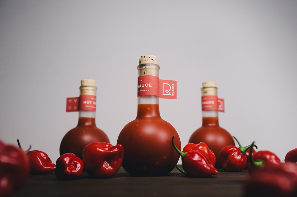 Тема алхимии проскальзывала в наших обзорах – например, писали про премиальное оливковое масло. Румынский дизайнер Stefan Andries представил концепцию упаковки для жгучих соусов Rubedo. Колба алхимиков, название, в переводе означающее последнюю стадию в процессе получения философского камня.