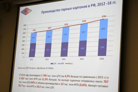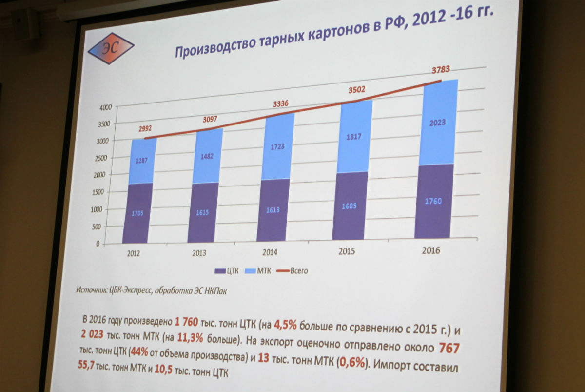 По данным Росстата, в 2016 г. объём производства гофротары (коробов и ящиков) в России составил 4738 млн м2, что на 213 млн м2 больше, чем в предыдущем году, а производство товарного гофрокартона составило 1011 млн м2, что на 4 млн м2 (0,4%), больше, чем в 2015 г.