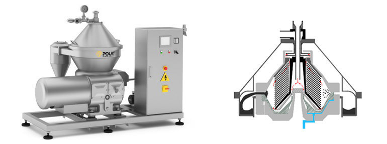 Cепаратор с автоматической очисткой чаши. Шлам, собирающийся в чаше, сбрасывается через периодические интервалы времени, установленные на панели управления. Открытие чаши происходит за счет воды и управляется электромагнитными клапанами. Чаша сделана из дуплексной нержавеющей стали (DIN 1.4462), используя новейшие технологии, обладает высокой механической прочностью и устойчива к коррозии.
