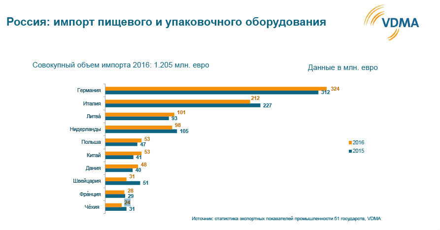 Россия по-прежнему является одним из важнейших в мире рынков сбыта для обрабатывающего и упаковочного оборудования. Даже в годы кризиса российская индустрия пищевых продуктов и напитков ввозила машины на сумму 1,2 – 1,3 млрд евро. Доля таких машин, поставляемых Германией, регулярно составляла от 25 до 35 процентов. После резкого сокращения экспорта машин для переработки пищевых продуктов и упаковочного оборудования из Германии в 2015 г. в 2016 г. объем поставок в Россию вновь вырос на 4 процента, составив 325 млн. евро.