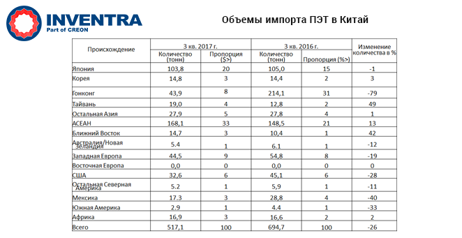 Импорт ПЭТ-отходов в Китай сократился в 3-м квартале 2017 г. на 177.6 тыс. т или 26% по сравнению с показателями за 2016 г., которые составили 517 тыс. т. К концу 2017 г. китайскими властями был запрещен ввоз 24 видов материалов, включая бумагу и пластик. По заявлению правительства страны, впредь они будут принимать только перерабатываемые материалы с уровнем загрязнения не более 0.3%.