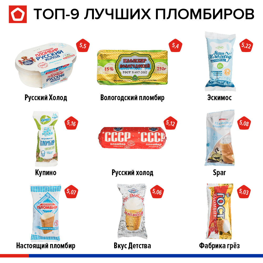 Топ-5 по органолептике среди товаров без нарушений составили пломбиры «Чистая линия» (5,1 балла), «Вологодский пломбир» (5 баллов), «Филевский» («Айсбери», 4,95 балла), «Настоящий пломбир» (ИП Шибаланская А.А., 4,6 балла), «Русский Холод» и «Коровка из Кореновки» (по 4,5 балла). Любопытно, что высшую оценку в 5,5 балла за органолептику получили товары с нарушениями «Ваш пломбир» (заниженная жирность) и «Село зеленое» (недовес).