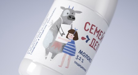 Families who own private dairy production do not just work on the farm: they live there. This is a life full of work, enthusiasm, joy and funny stories, which eventually become family legends. We decided to transfer this unique spirit by showing on the package live stories about family dairy production. The design uses a series of illustrations (author Vera Zvereva), solved in a warm and slightly naive manner. The main heroes of graphic sketches were a girl and a cow, which from the category character turned into a real member of the "dairy family".