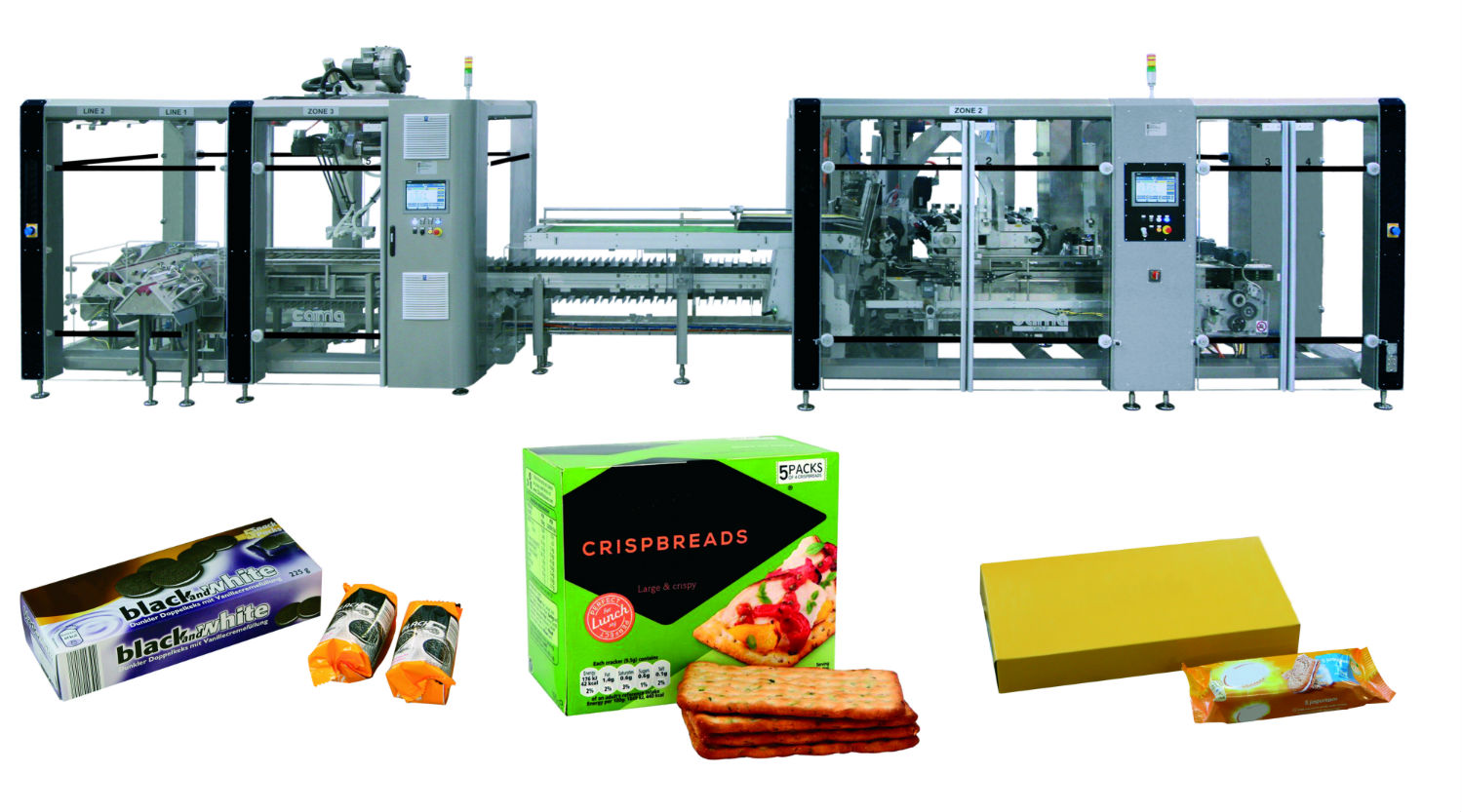 This is a complete system for handling of flow-packed crispy bread in piles into pre-glued cartons. The line, sold to a global leader in the food sector, incorporates a Cama Triaflex Delta robot top-loading unit with a high-speed continuous motion cartoner. The combined system is designed to handle 2 different product types in several loading configurations. Flowpacks are delivered up to 600 pcs/minute to the CAMA line, where they are received by a vertical race track. The Cama Delta robot picks the flow wraps and places them in the right orientation onto the conveyor of the cartoning machine. The robot creates the necessary loading pattern, giving the opportunity to handle flat and on-edge configurations, with or without product rotation within the carton. The Continuous motion cartoner side-loads the groups of flowpacks into pre-glued cartons. Speed can range, according to the different products and configuration, from 80 to 200 cartons per minute. A key winning factor for the customer is the ability to future proof the guaranteed return on investment (ROI) through the modular construction of the line, use of off-the-shelf and standardized components, and the capability to have the addition of a second loading unit in the future – providing an easy upgrade for additional production capacity. Versatility, reliability and ease of size change are standard components for a Cama installation. This line is a great example of Cama’s Unique Selling Proposition, providing Experience, Technology and Service with the combination of 4-axis robots and high-speed cartoners under the same hardware and software platform.