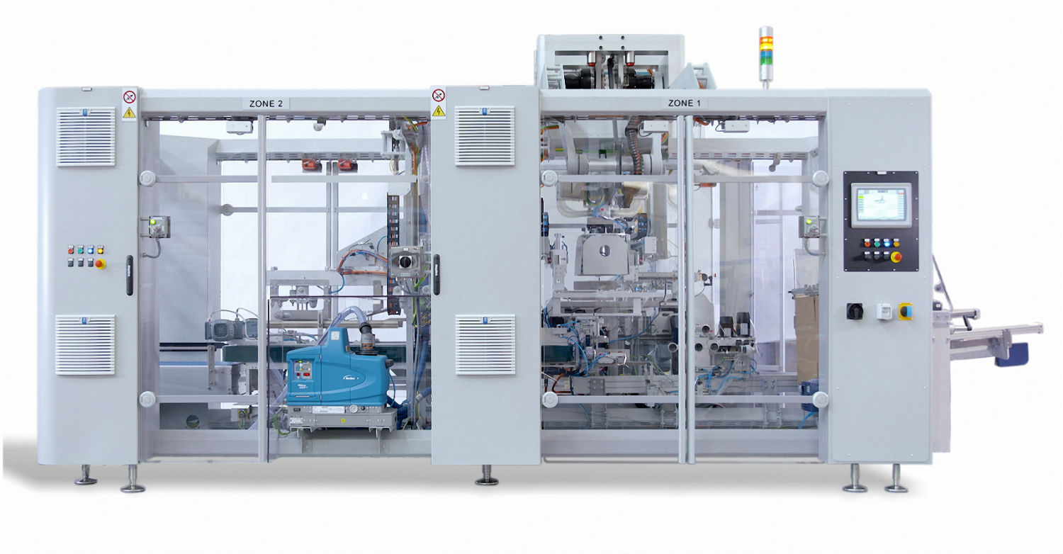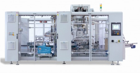 Products arrive on one or two lanes and are conveyed to the unit infeed where two vision guided robots sort and pick loose products and prepare the requested layer configuration. The grouped products are then collected by a two-axis robot by means of a pick-up head and loaded inside the RSC case previously erected. Loaded packages are then transferred to the sealing unit where the top flaps are folded and closed. 11 different formats in RSC Case styles are handled up to a max speed of 120 products per minute. Downtime for size changing is drastically reduced through this innovative concept.