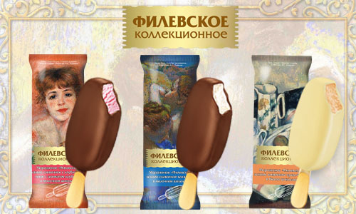 В линейке Филевского эскимо три вида вкуса: крем-брюле в белом шоколаде, ванильное и клубничное в молочном шоколаде. Для дизайна упаковки использованы изображения картин из собрания музея: «Персики и груши» Поля Сезанна, «Портрет актрисы Жанны Самари» Пьера Огюста Ренуара и «Голубые танцовщицы» Эдгара Дега.