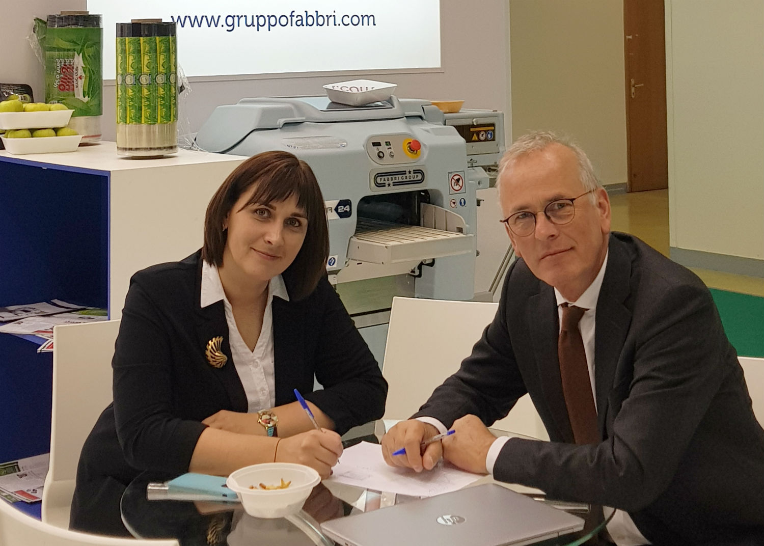 Также у нас на стенде представлен небольшой трейсилер – оборудование для запайки лотков в среде ГМС. И, конечно, у нас есть и большие машины этого класса – и для запайки, и для упаковки в вакуум и скин-упаковку, но на выставке у нас представлено оборудование среднего класса. Надо сказать, что FABBRI GROUP давно известна на рынке – наши индустриальные машины с успехом работают на многих предприятиях России, в частности на крупнейших птицефабриках. Еще одно направление бизнеса – это упаковочные материалы и пленки, в том числе и с печатью: ПВХ-пленки, стретч, барьерные пленки, которые тоже производит FABBRI GROUP.