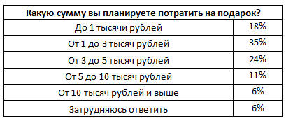 Более трети мужчин (35%) готовы потратить на подарок к 8 марта от 1 000 до 3 000 рублей. Почти четверть опрошенных планирует обойтись самым бюджетным вариантом презента (до 1 000 рублей). От 10 000 рублей на подарок готовы потратить 6% россиян.
