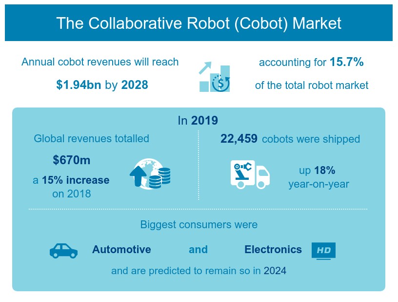 Interact Analysis прогнозирует, что годовой доход рынка коботов достигнет 1,94 млрд долл. США в 2028 г., что составит 15,7% от всего рынка роботов.