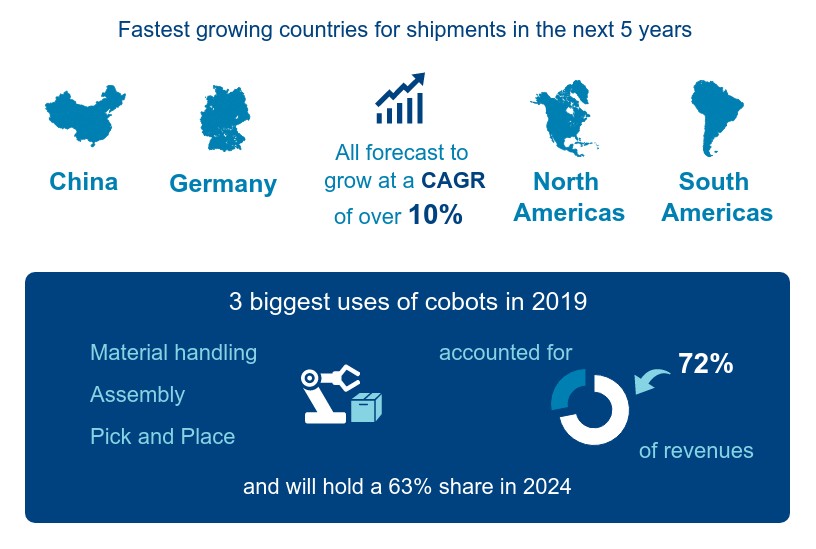 Три основных вида использования коботов в 2019 г. – это транспортировка материалов, сборка, а также подъём и перемещение, на них приходилось 71,9% доходов от коллаборативных роботов и, по прогнозам, к 2024 г. их доля составит 63%.