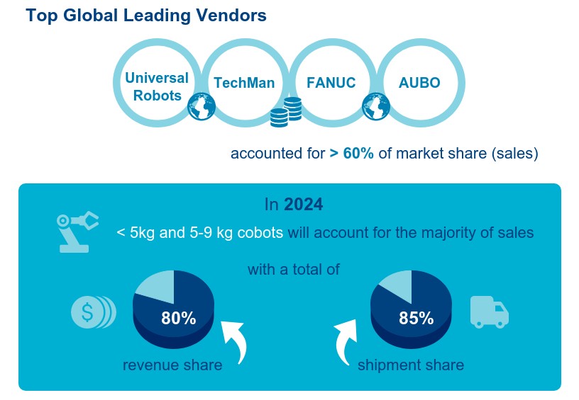 Ведущими мировыми поставщиками коботов были Universal Robots, Techman, FANUC и AUBO, и на них приходилось более 60% доли рынка в продажах.